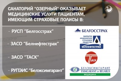 ОАО "Санаторий "Озёрный" оказывает медицинские услуги пациентам, имеющим страховые полисы в РУСП "Белгосстрах"РУПЭИС «Белэксимгарант» , ЗАСО «Белнефтестрах» и ЗАСО «ТАСК».