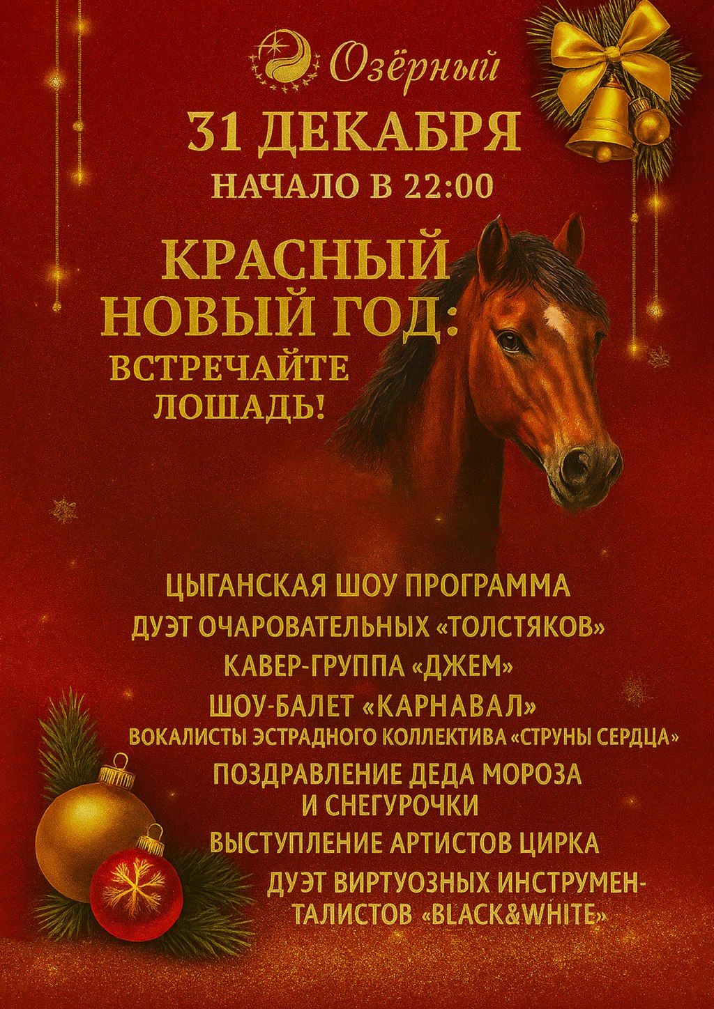 Приглашаем вас встретить самый волшебный праздник года в уютной и праздничной атмосфере санатория «Озёрный»! Вас ждёт яркая шоу-программа, изысканное угощение, незабываемые эмоции и по-настоящему новогоднее настроение.